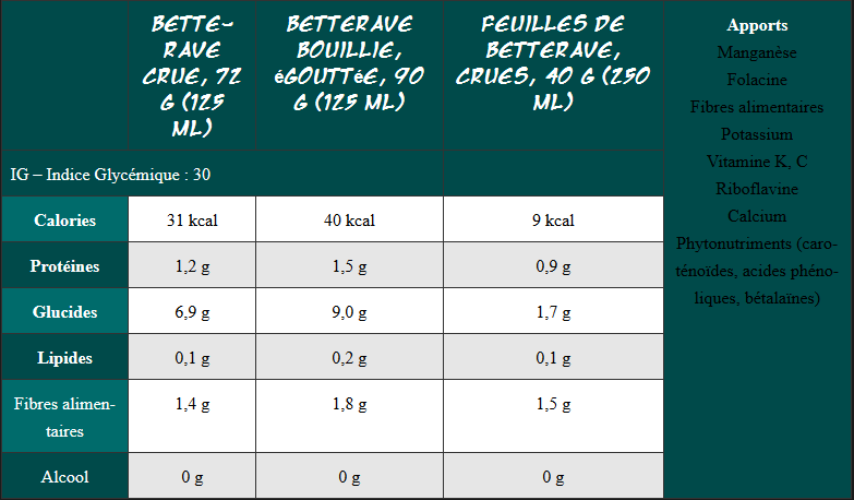 La betterave a la plus forte teneur en sucre de tous les légumes, mais elle n'apporte que 43 calories pour 100 grammes. Elle contient de la folacine, des fibres et des antioxydants ; elle est aussi riche en glycine bétaïne, un phytonutriment qui contribue à réduire l'homocystéine sanguine, un facteur de risque des maladies cardiaques. Ses fanes contiennent près de neuf fois l'apport quotidien recommandé en vitamine K, essentielle pour la santé osseuse, et de la vitamine A. La consommation de betteraves peut colorer l'urine et les selles en rouge, mais c'est une réaction temporaire et inoffensive.